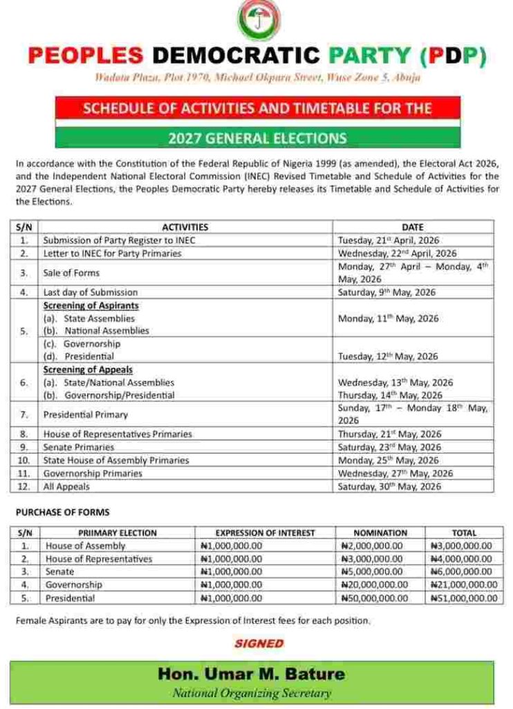 THE MINISTER of Federal Capital Territory, Nyesom Wike-backed Peoples Democratic Party (PDP) has released its timetable and schedule of activities for the 2027 general election.