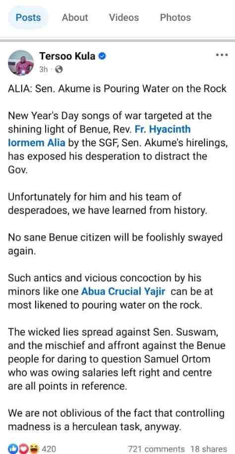 Kula, who stated that he is no longer a journalist but a public relations practitioner, and a son to Governor Alia, debunked claims that he insulted Senator Akume, although he condemned the SGF for remaining silent while a group of women, nicknamed ‘Agidi Choir, and other pro-SGF stakeholders sang and uttered derogatory words against the governor.