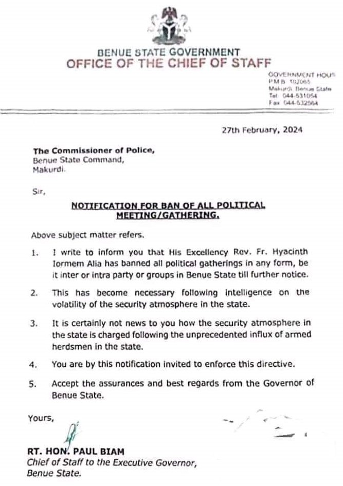 “1. I write to inform you that His Excellency Rev. Fr. Hyacinth Iormem Alia has banned all political gatherings in any form, be it inter or intra party or groups in Benue state till further notice.