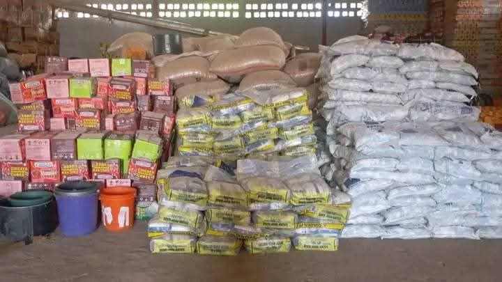 Items distributed included 2,300 bags of 25-kilogram rice, 600 bags of beans, 1,600 cartons of noodles, 150 gallons of palm oil, 140 cartons of Maggi seasoning, 160 bags of salt, and 160 gallons of groundnut oil.