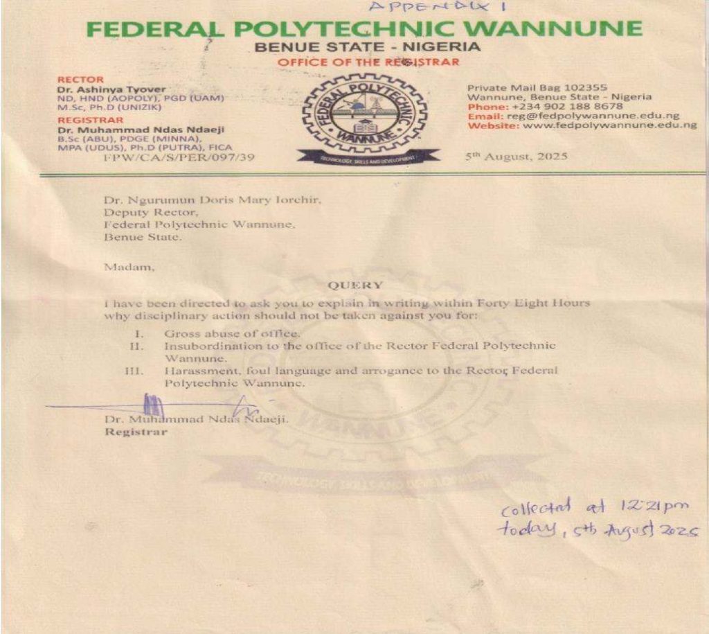 The query, dated August 5, 2025, was delivered to Dr. Iorchir’s office at 12:21pm same day, as indicated on the copy obtained by National Record, demanded that she “explain in writing within 48 hours why disciplinary action should not be taken against her for: “I. Gross abuse of office II. Insubordination to the Office of the Rector, Federal Polytechnic Wannune. III. Harassment, foul language and arrogance to the Rector, Federal Polytechnic Wannune.”