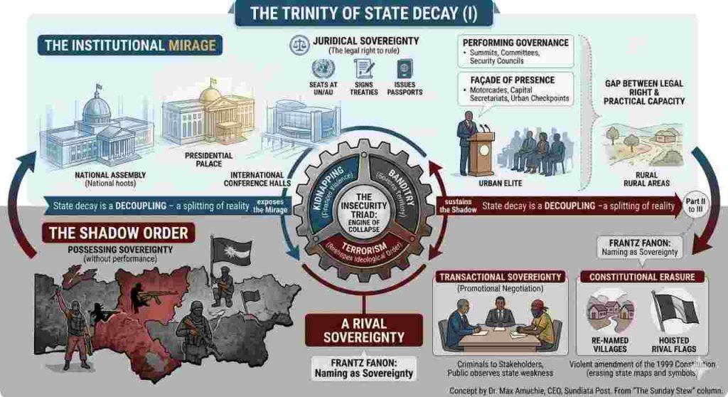 The Trinity of State Decay holds that Nigeria’s crisis is not simply one of state weakness or failure in the traditional sense. It is a decoupling — a splitting of reality into two rival orders: the Institutional Mirage, which performs sovereignty without possessing it, and the Shadow Order, which possesses sovereignty without performing it.